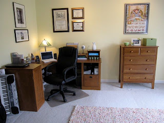 And that brings me to today’s subject: my new office and studio, from which I write most of my songs and do my blogging. Beginning in June, I will be teaching all lessons and providing music therapy here, which will be a nice change after going to my students’ homes for the past two years. As my practice has grown, it’s been hard to keep up with all that driving; I’m sure many of you know that feeling! Now on with the tour.