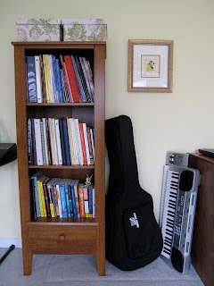 Here is the bookcase that houses the many music books and binders I’ve accumulated over the years, as well as books and other resources I use on a regular basis. My guitar hangs out there when it’s not in the trunk of my car, along with a small keyboard for the little ones and a MIDI keyboard I use for recording.