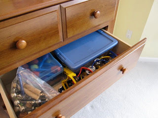 I wasn’t so crazy about the idea of storing all my musical instruments and music therapy supplies in plain view, so I bought this chest of drawers, which matches my bookcase and desk. For now, it stores almost everything, though I’m sure it won’t take long to run out of room.