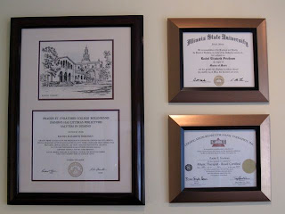 My undergraduate diploma from Rollins College is on the left, though it’s hard to tell considering the entire thing is in Latin. Good thing I studied the language for four years in high school so I can read it! At the top right is my master’s degree diploma from Illinois State University, and underneath it is my Certification Board of Music Therapy certificate.